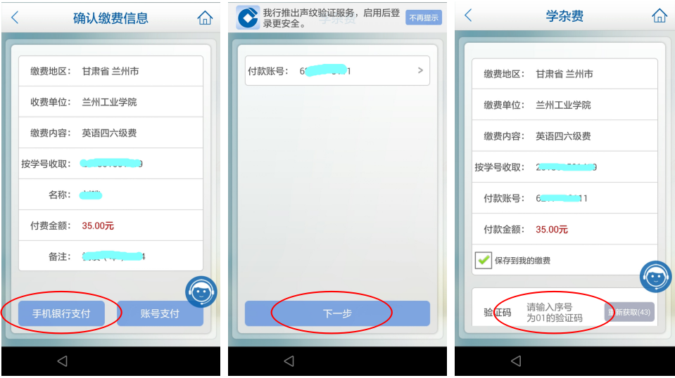 (5) 确认缴费信息,检查学号和名称,点击手机银行支付(未登录弹出登录窗口)。