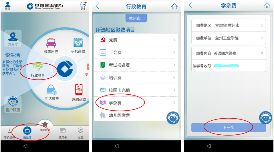 (4) 进入“学杂费”界面,依次选择地区与单位,按照图中方式依次选择(甘肃省兰州市,兰州工业学院,缴费内容选择(根据报名内容选择英语四六级费或英语A级费),填写学号,点击下一步。