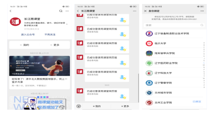 3.学习要求:任课教师需按时全程积极参与。培训课前,任课教师需进行身份绑定,该绑定是教师利用雨课堂工具开展课堂教学时的身份依据,也是学校后台教学数据统计的依据。具体绑定过程:①关注“雨课堂”微信公众号(或微信小程序中搜索“长江雨课堂”并关注),②进入【长江雨课堂】公众号,点击菜单栏里【更多】-【身份绑定】;③选择兰州工业学院,输入账号及密码(默认账号:工号,密码:工号后6位)完成绑定。如未绑定成功,可以旁听生身份进入。